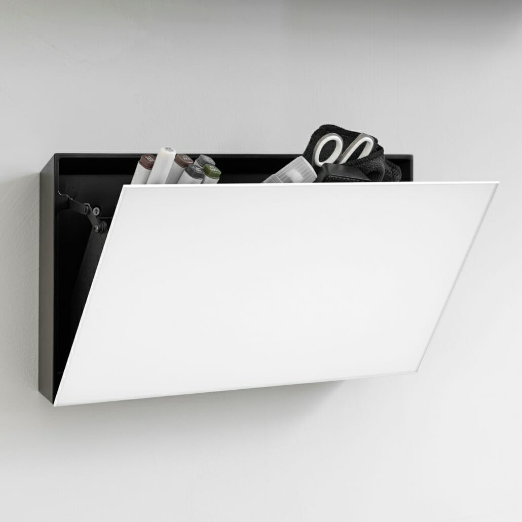 Smart förvaring av pennor, tavelsudd, fjärrkontroll m.m. Svart aluminiumstomme med glasfront i någon våra 24 utvalda färger. Förvaringsutrymmet kan anpassas genom två löstagbara innerväggar.